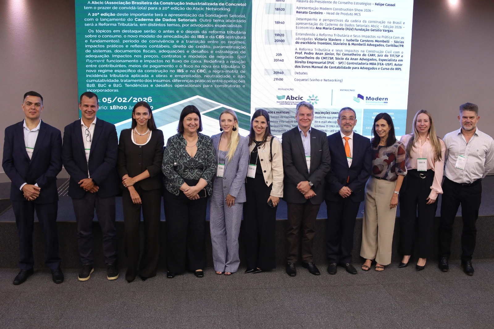 No dia 5 de fevereiro, o Abcic Networking XXI reuniu associados, arquitetos, engenheiros e representantes de entidades setoriais (ABECE, Abramat, Ibracon e Sinaprocim) para debater dois temas importantes para o segmento: a Sondagem do Setor de Pré-Fabricados de Concreto e os impactos da Reforma Tributária, além de apresentar informações sobre a segunda edição do Modern Construction Show, marcada para ocorrer entre os dias 29 de setembro e 1º de outubro, no Distrito Anhembi.