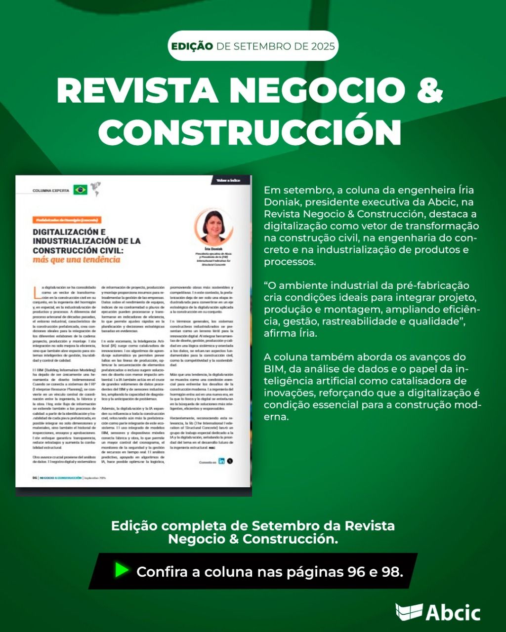 A edição de setembro da Revista Negócio & Construcción trata do tema digitalização, que tem se consolidado como vetor de transformação na construção civil como um todo, na engenharia do concreto e, em especial, na industrialização de produtos e processos.