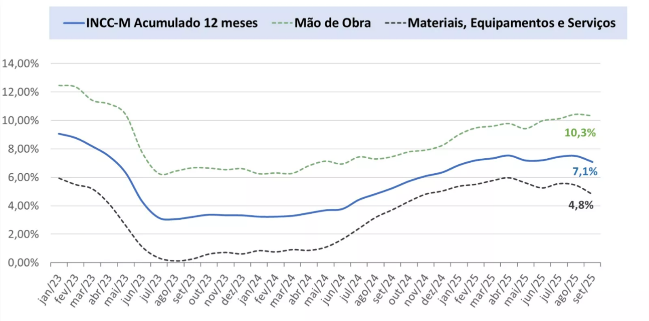 O Índice Nacional de Custo da Construção – M (INCC-M) registrou alta de 0,21% em setembro, abaixo da taxa de 0,70% observada no mês anterior, de acordo com dados divulgados pelo FGV IBRE. Apesar dessa desaceleração, a tendência de aumento nos custos é reforçada pela taxa acumulada em 12 meses, que atingiu 7,07%. Esse resultado representa um avanço expressivo em comparação com setembro de 2024, quando o índice acumulava alta de 5,23%.