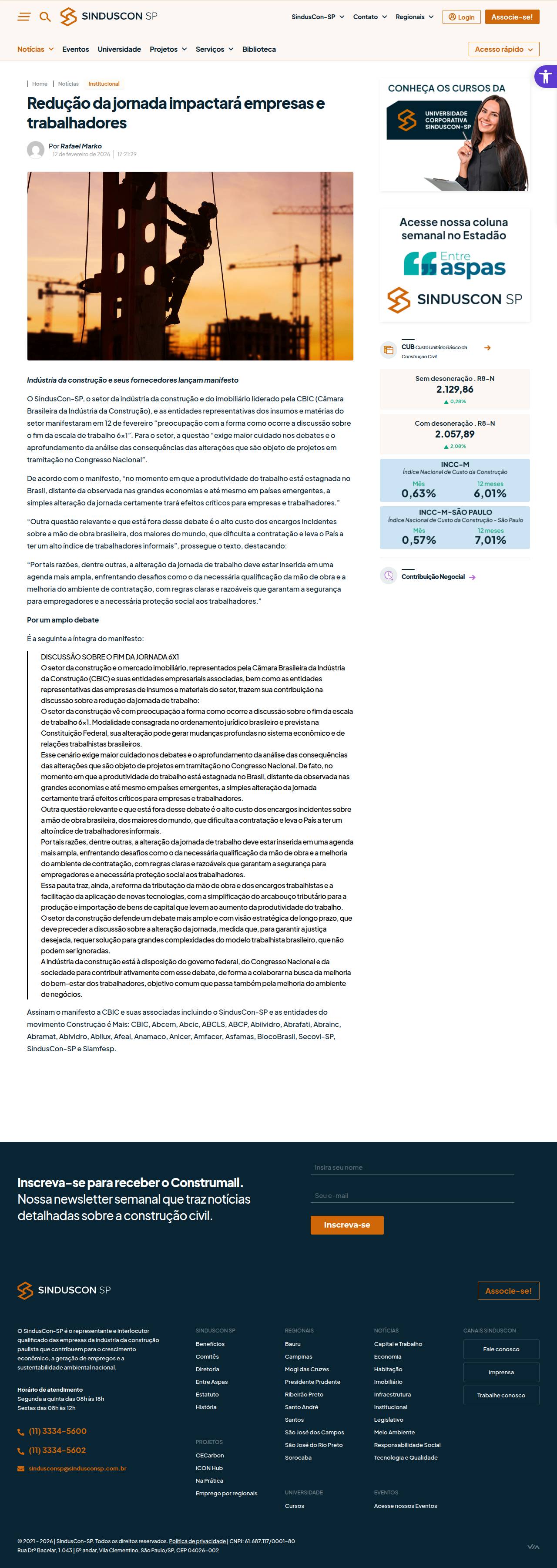 Redução da jornada impactará empresas e trabalhadores Sinduscon-SP